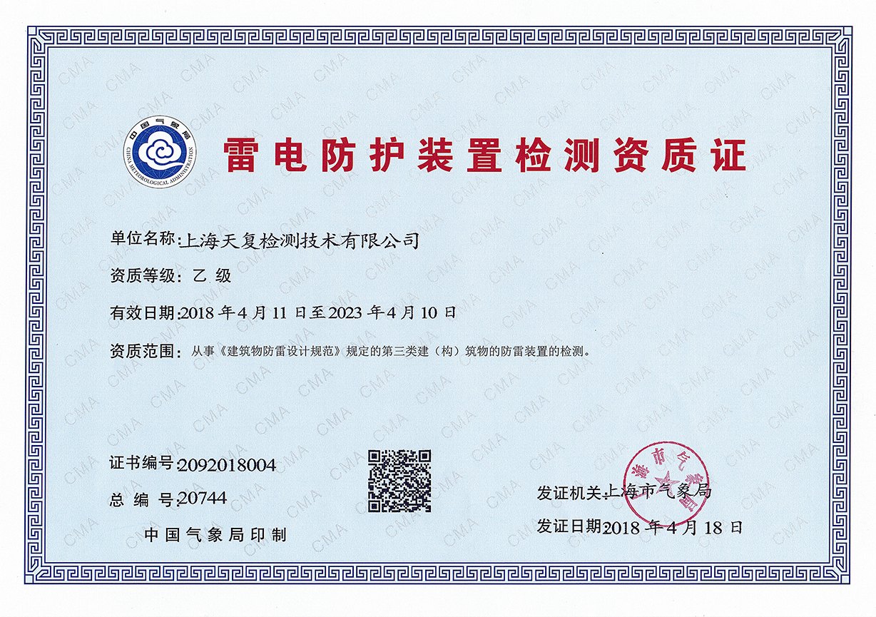 根据《雷电防护装置检测资质管理办法》(中国气象局令第31号)要求,上海市气象局委托雷电防护装置检测资质评审委员会开展资质评审工作,经过专家评审和投票,上海天复检测技术有限公司最终取得上海气象局颁发的雷电防护装置检测资质证。